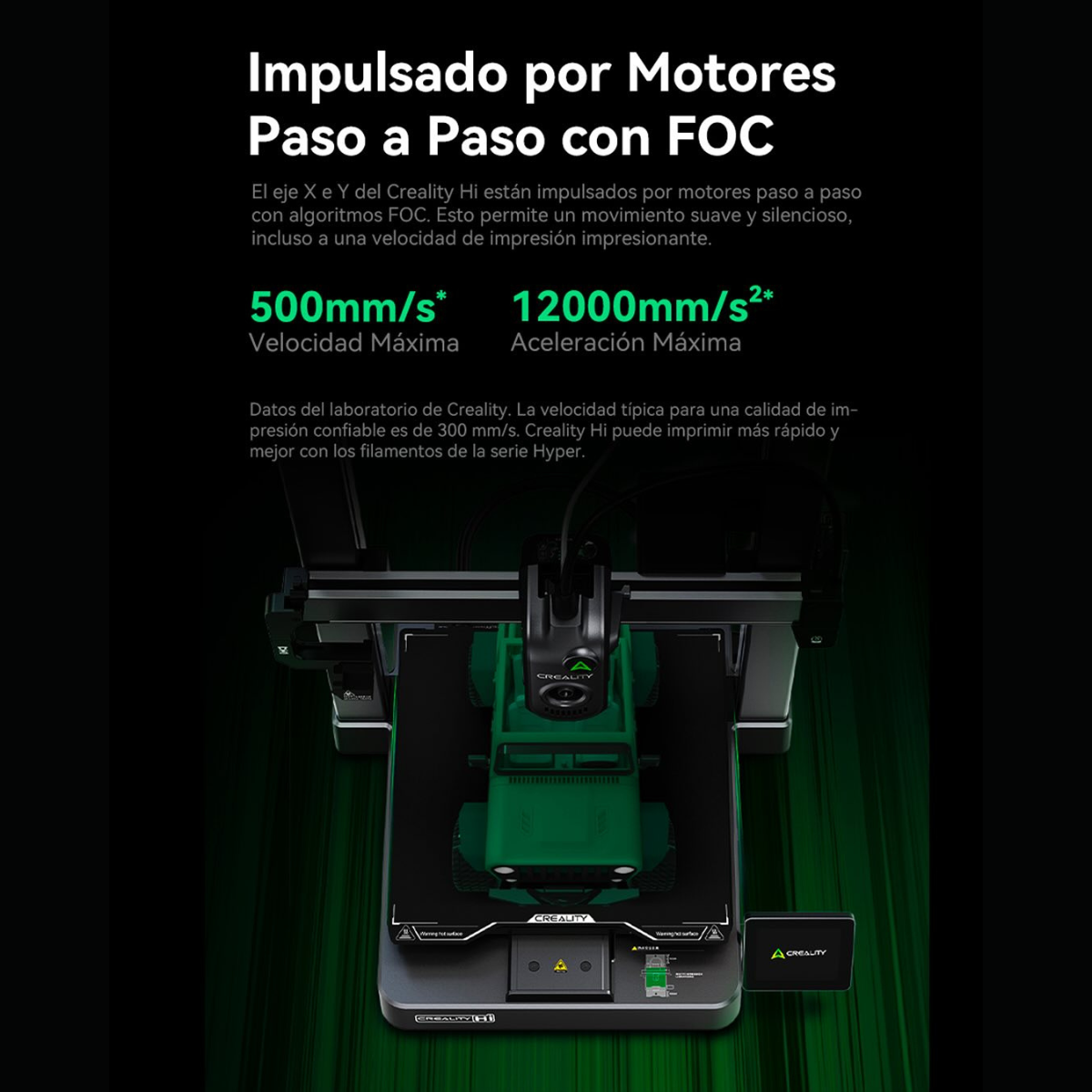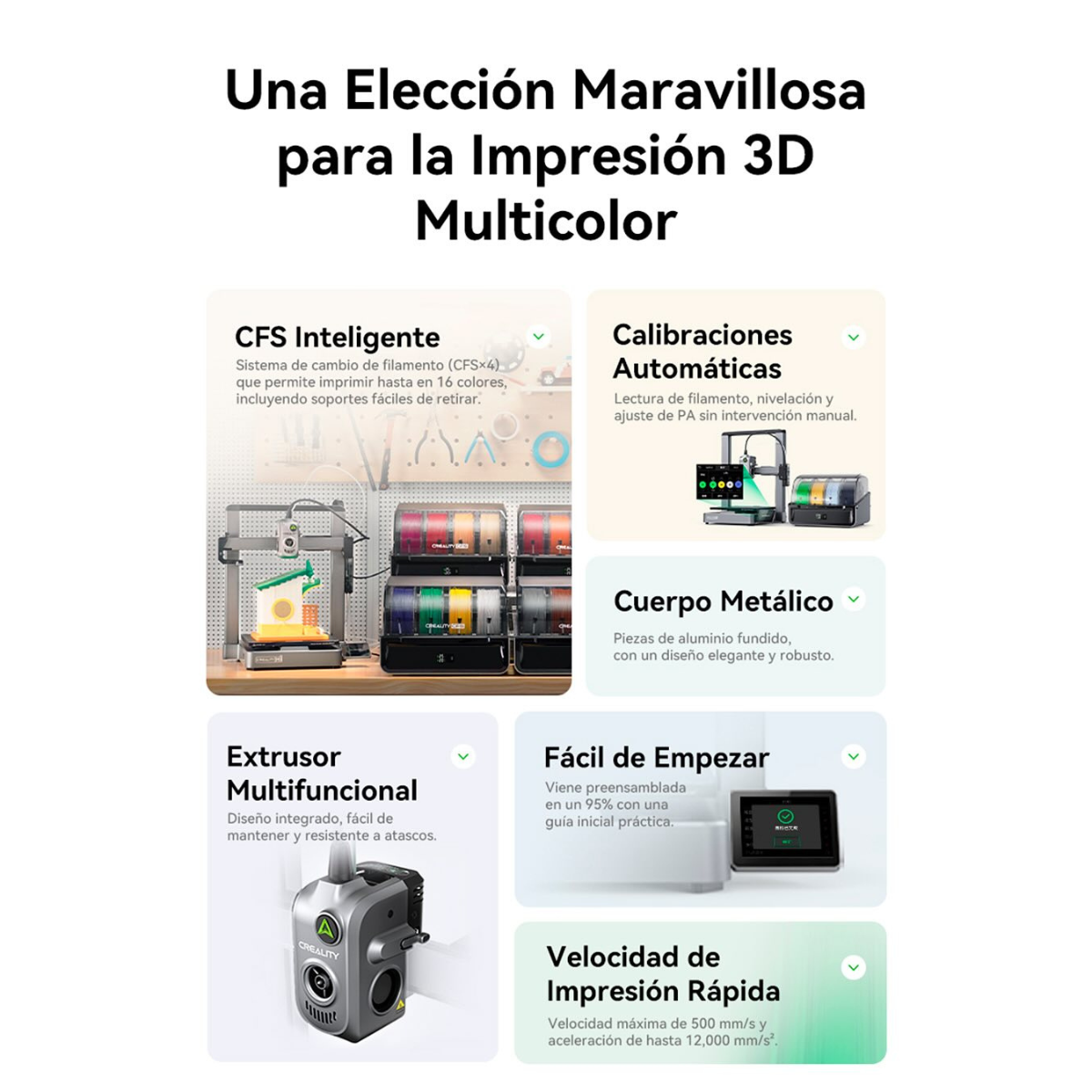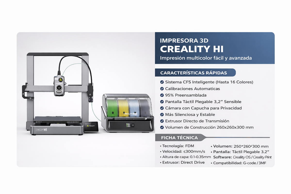 La Creality Hi es una impresora 3D FDM potente, silenciosa y fácil de usar, ideal tanto para principiantes como para usuarios avanzados. Gracias al sistema CFS Inteligente, permite imprimir hasta 16 colores (con 4 CFS, incluye 1), eliminando retoques posteriores. Su calibración totalmente automática, estructura metálica rígida y alta velocidad garantizan impresiones precisas y de gran calidad.