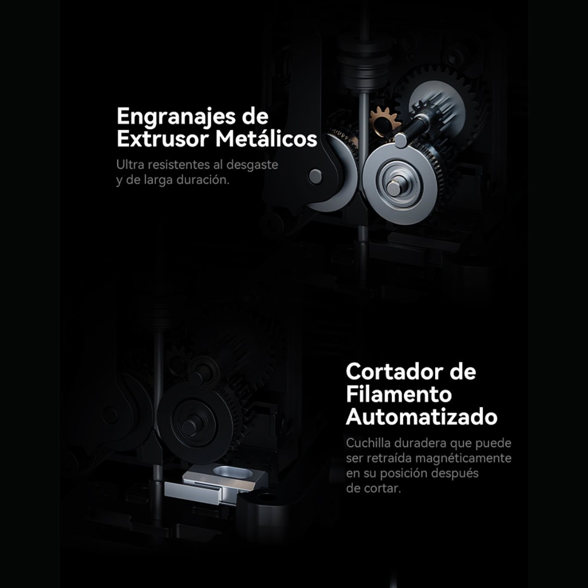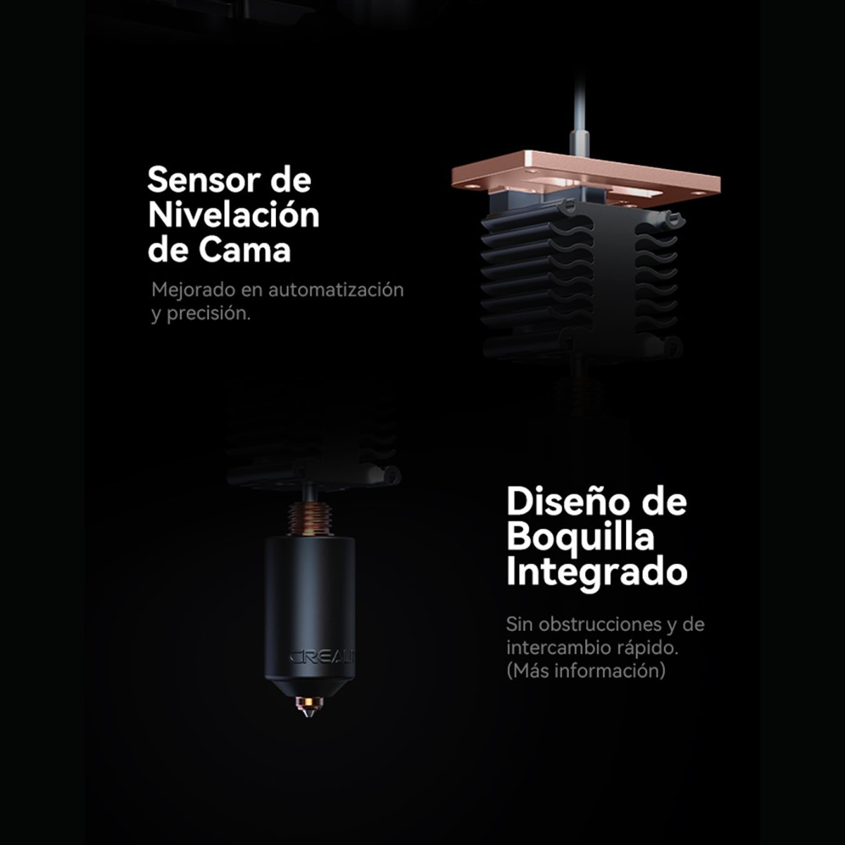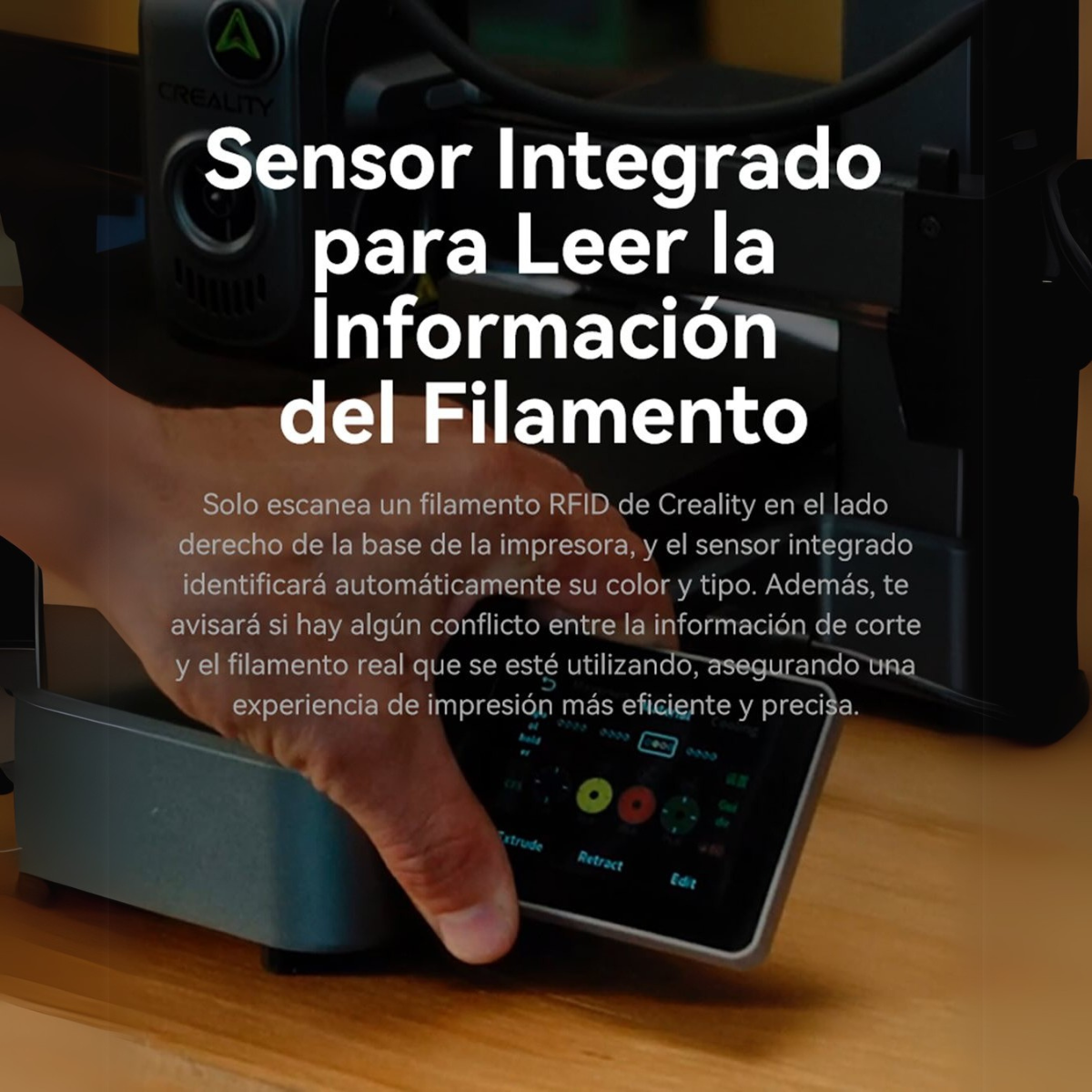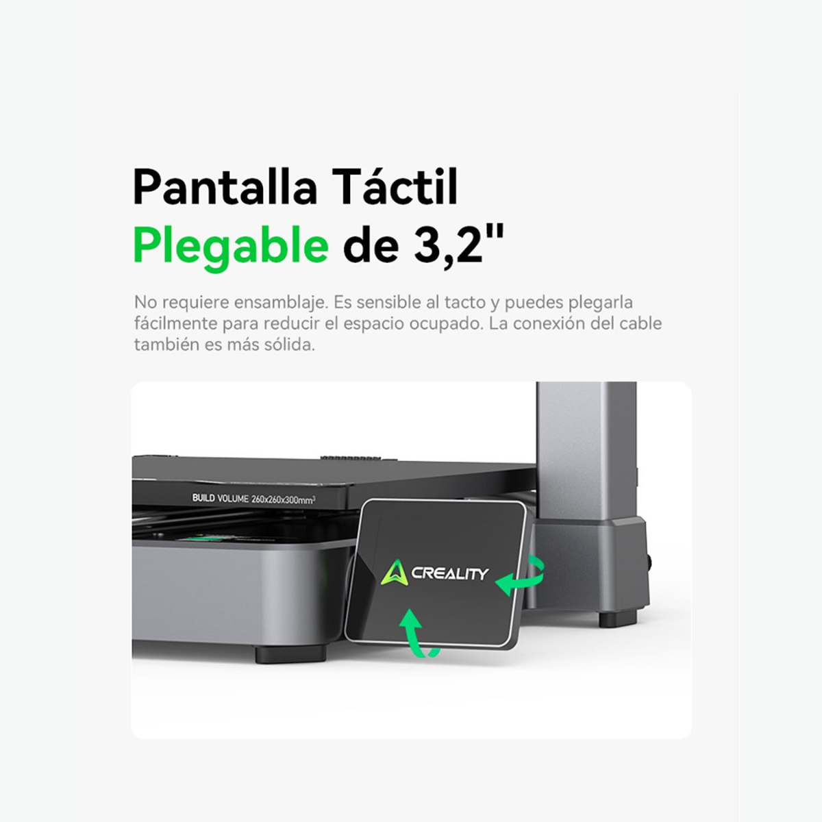 Incluye pantalla táctil plegable de 3,2”, cámara integrada, conectividad WiFi/USB, y el avanzado Creality OS, que optimiza el flujo de trabajo y permite gestión inteligente de filamentos y control remoto mediante Creality Cloud.