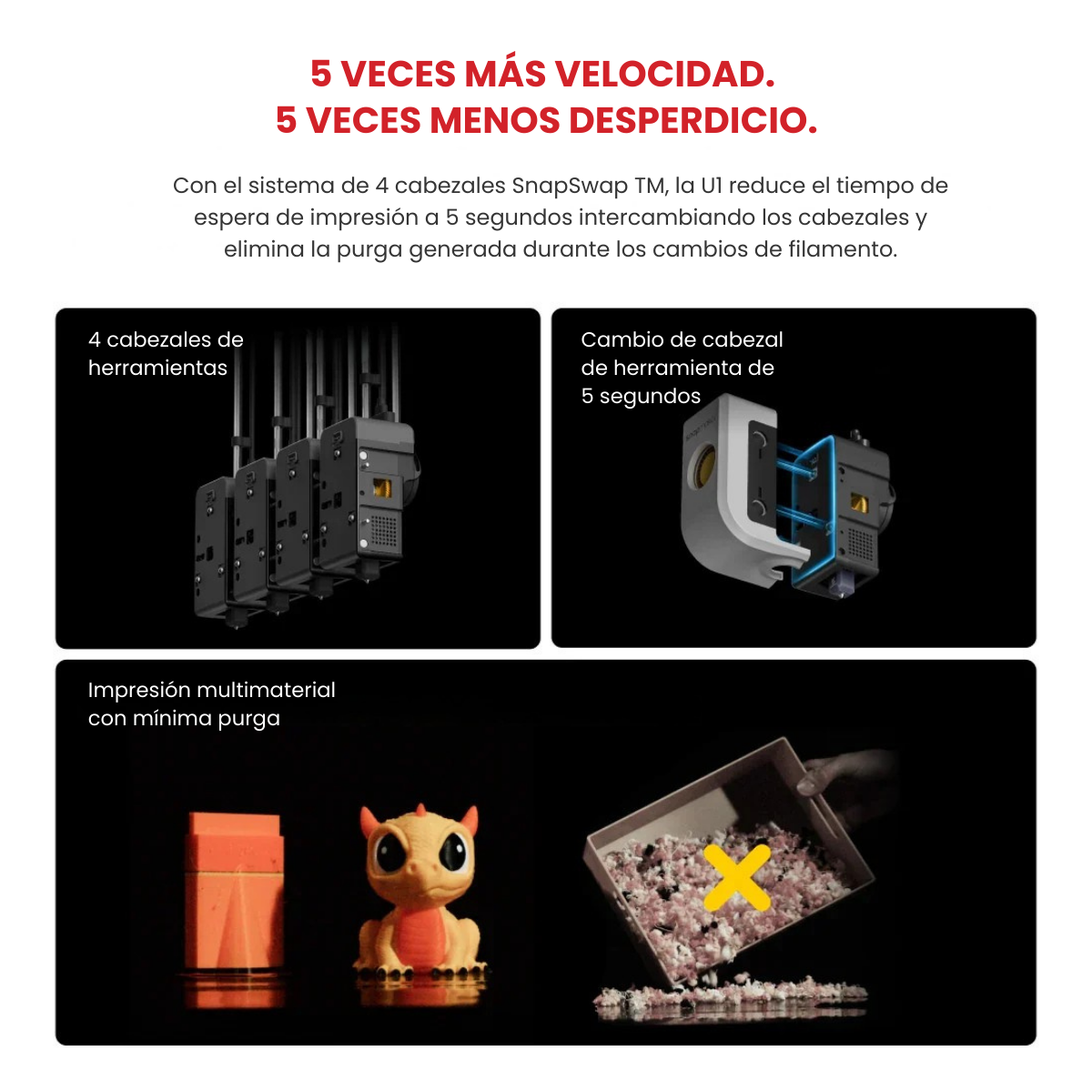 Su principal ventaja es la posibilidad de imprimir en multicolor y multimaterial real sin generar desperdicio por purga y sin contaminación entre materiales o colores. Todo esto se combina con una arquitectura CoreXY de alta velocidad, pensada para ofrecer productividad, precisión y versatilidad.